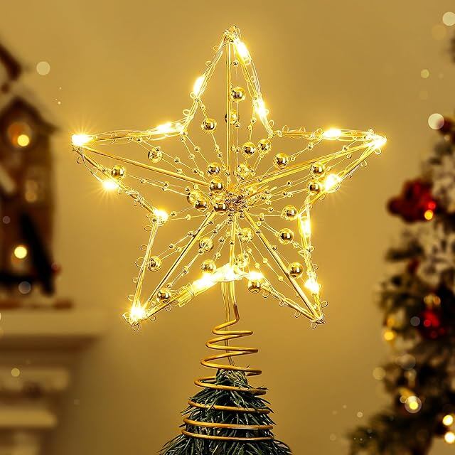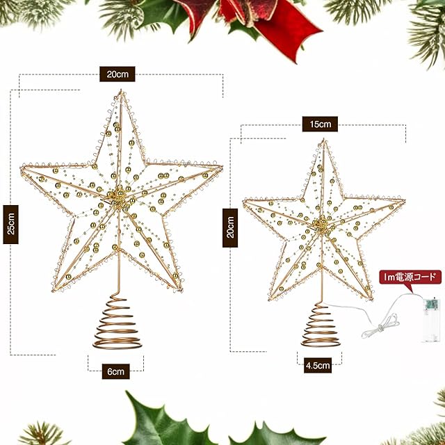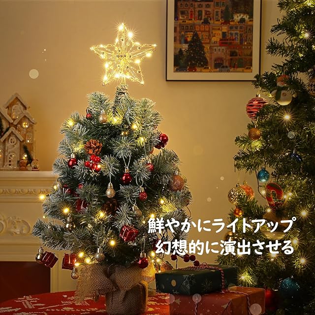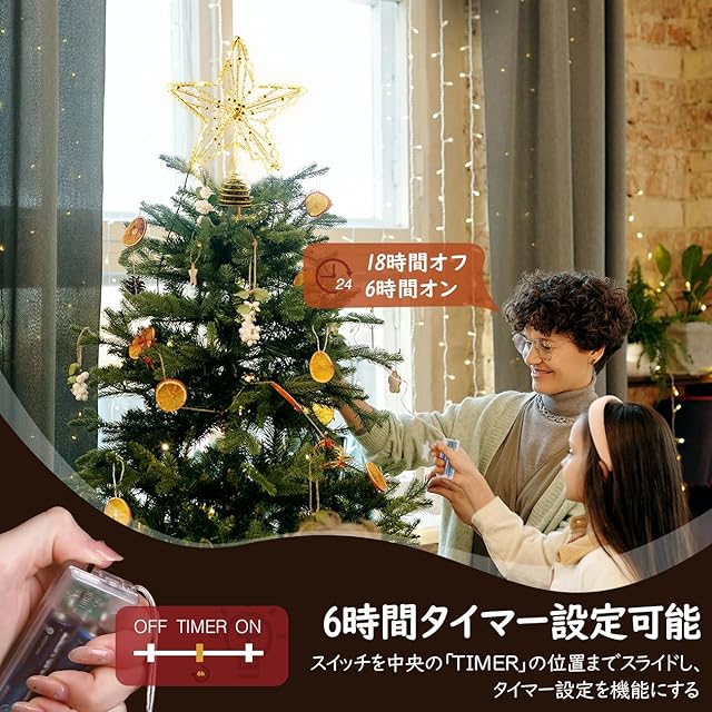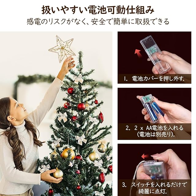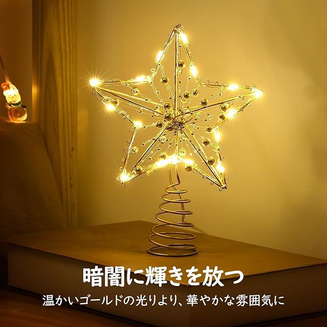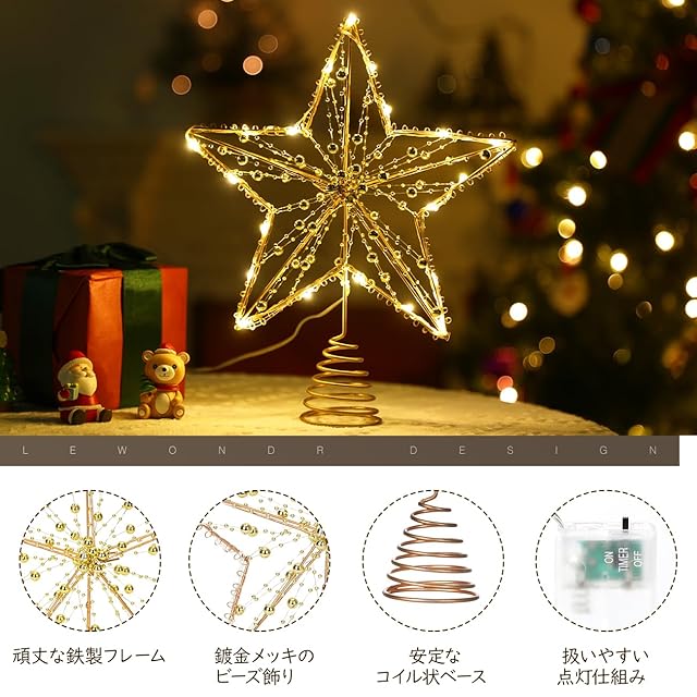 「ツリーを幻想的に演出」星表面には複数の鍍金メッキビーズが施されており、LEDワイヤも巻かれており、3本のAA電池で可動させる扱いやすい簡単な仕組みより、スイッチを入れるだけで、すぐに上品な輝きを放ち、電量消耗を減少させる6時間タイマー設定可能な仕様に改良されており、クリスマスの演出をより楽しむことができます。