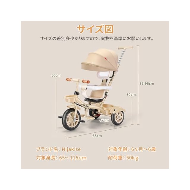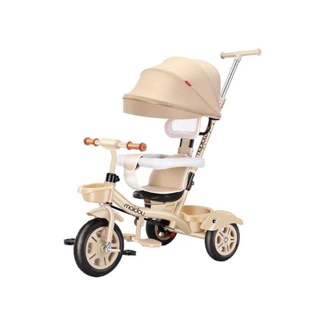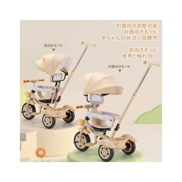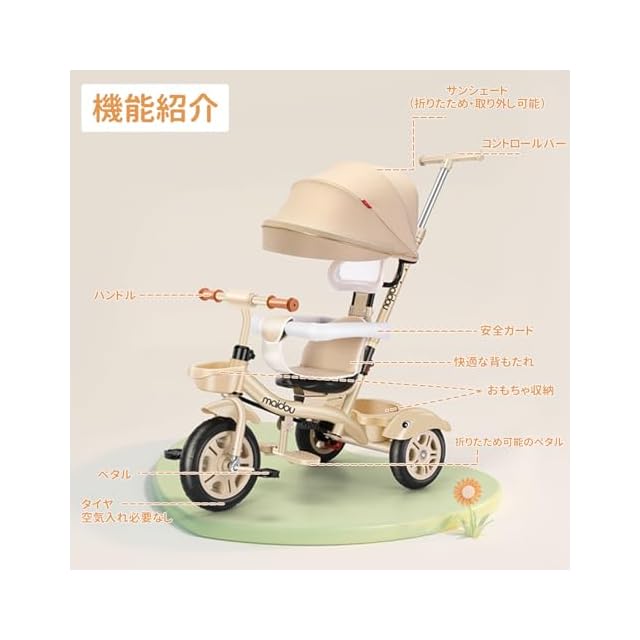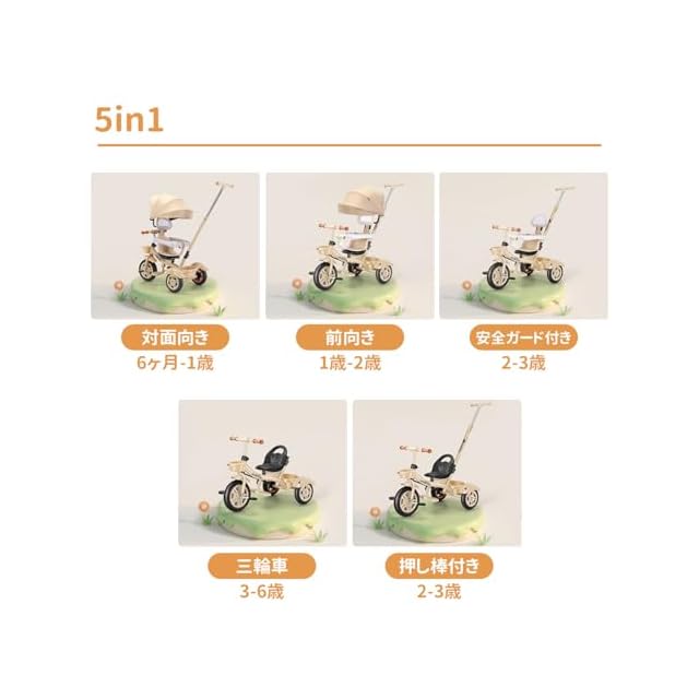 【1台5役子供用三輪車】5通りの使い方ができ、お子様の成長にあわせて長く楽しめる多機能三輪車です。ベビーカー、三輪車、バランスバイクなどの様々なパターンで使える乗り物です。日光をカバーすることで暑さ対策に役立ち、ベビーカーのように使える点が魅力です。