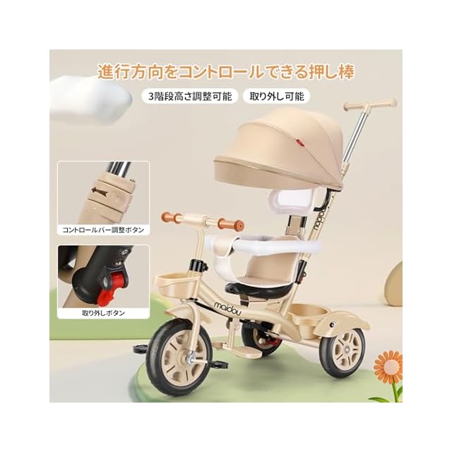 【押し棒高さ調節可能 ・ ペダルの脱着可能】子供用三輪車は脱着可能な押し棒は96cm,93cm,89cm三つの調節できる速度制御に役立ちます。身長に合わせてピッタリ長さを調節できます。三輪車の後部に付いているコントロールバーには進む方向を操作できる舵切り機能付き。ペダルの使用しない場合はサドルの下に保管できます。