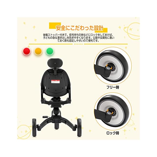 【安全にこだわった設計】シートベルトと安全カード付き、不意に身を乗り出したり、三輪車の揺れでずり落ちてしまうのを防ぎます。誤発進を防げるストッパー付きで、信号待ちや坂道に停車する際など、ペダルを漕いでも動かないよう固定したいときに便利です。
