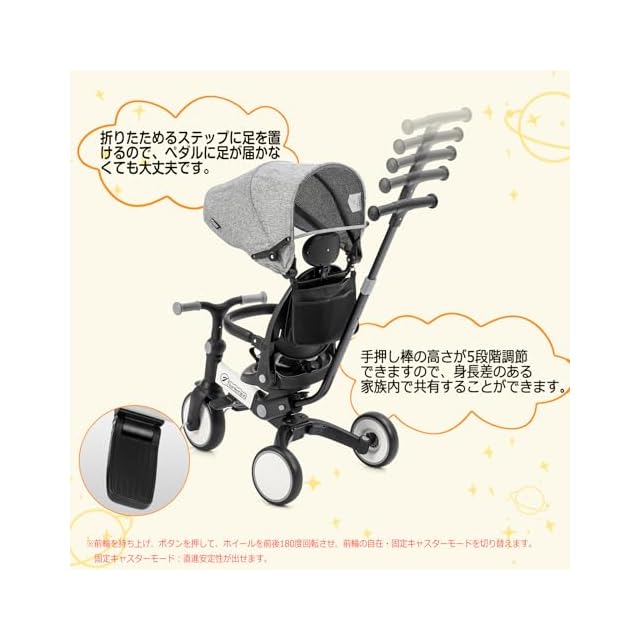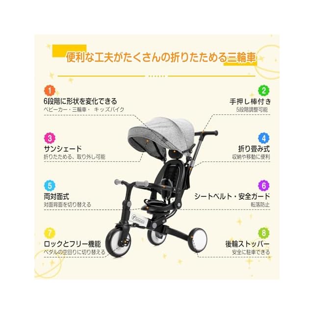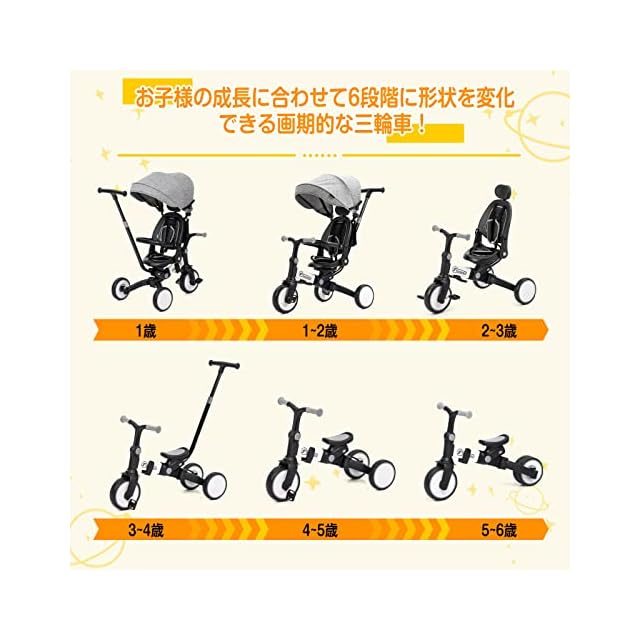 【1台6役子供用三輪車】6通りの使い方ができ、お子様の成長にあわせて長く楽しめる多機能三輪車です。ベビーカー、三輪車、キッズバイクなどの様々なパターンで使える乗り物です。日光をカバーすることで暑さ対策に役立ち、ベビーカーのように使える点が魅力です。