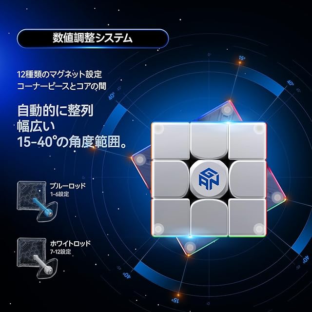 【自動角度調整】コーナーとコアには12通りの磁石設定があり、キューブを15度~40度の範囲で手前に自動的に固定し、回転をサポートします。