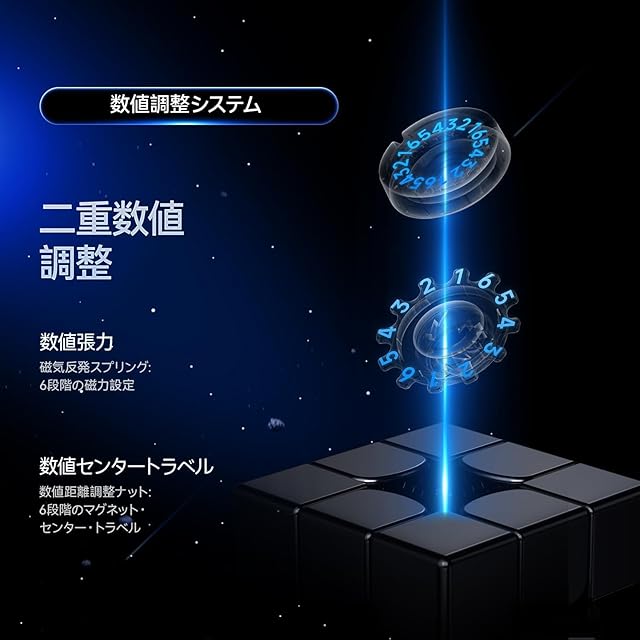 【二つの数字調整】革新的な構造により、磁石を利用してテンションとセンターの移動量を微調整できます。 テンションは6段階、センターは6段階で調整可能で、1つのキューブで多彩なプレイ感覚を楽しむことができます。