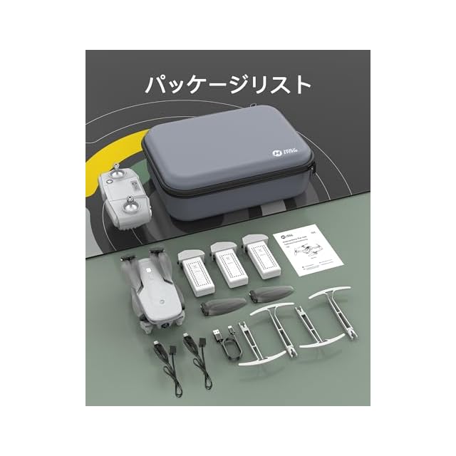 【パッケージリスト】本体*1 ;2.4G送信機*1 ;バッテリー*2; バッテリー充電ケーブル*1 ;予備プロペラ*2 ;プロペラガード*4; 収納ケース*1 ;送信機充電ケーブル*1