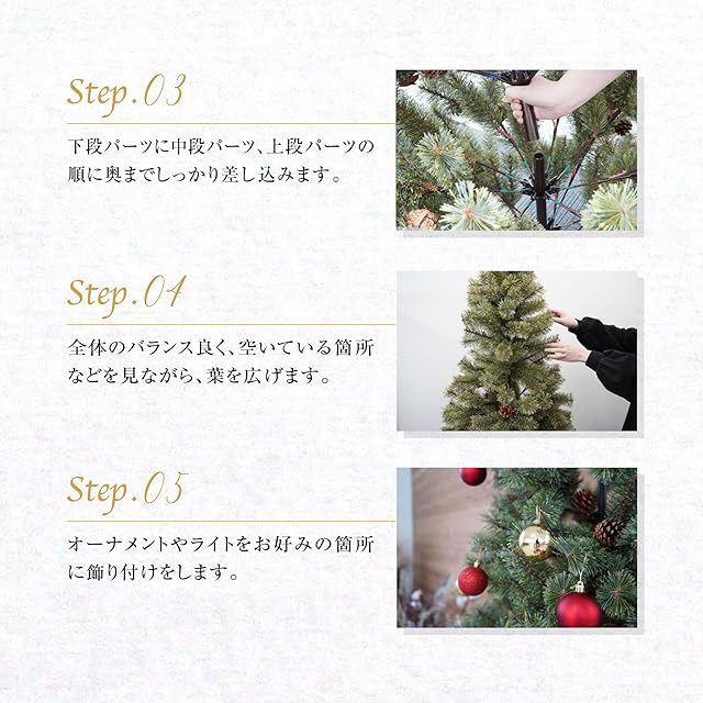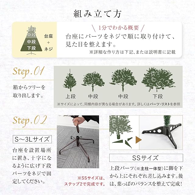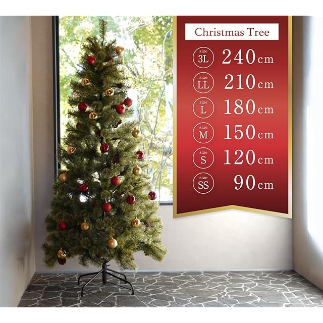 [組み立て簡単&4サイズ展開]簡単に組み立てられる設計のツリーは、不慣れな方でも手軽にセッティングが可能!また6サイズ(SS90cm・S120cm・M150cm・L180cm・LL210cm・LLL240cm)で展開されているため、設置場所や好みに応じて最適なサイズを選ぶことができます。