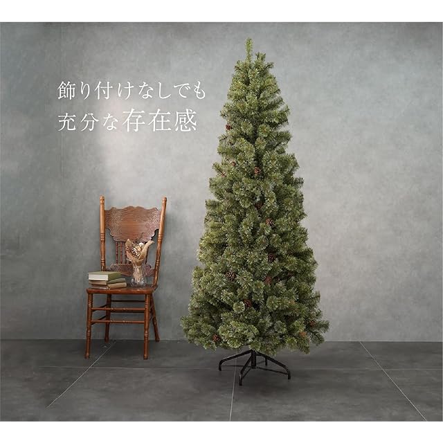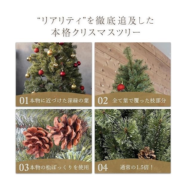 [豊富な枝数]どの角度から見ても綺麗な形状を保てるボリューム感が人気の秘密。豊富な枝数を持ち、密集した枝葉のボリューム感を実現。ツリー本体にボリューム感があるため、少ないオーナメントやイルミネーションの装飾でも高級感を醸し出します。