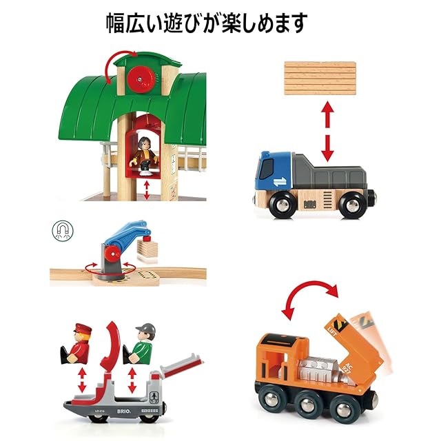 列車で運んだ荷物をクレーンで引き上げ、トラックに積み替える貨物遊びと、乗客や運転士を駅での乗せ下ろしする列車遊びができます。また電動車両と手動車両が入っているので、幅広い遊びが楽しめます。