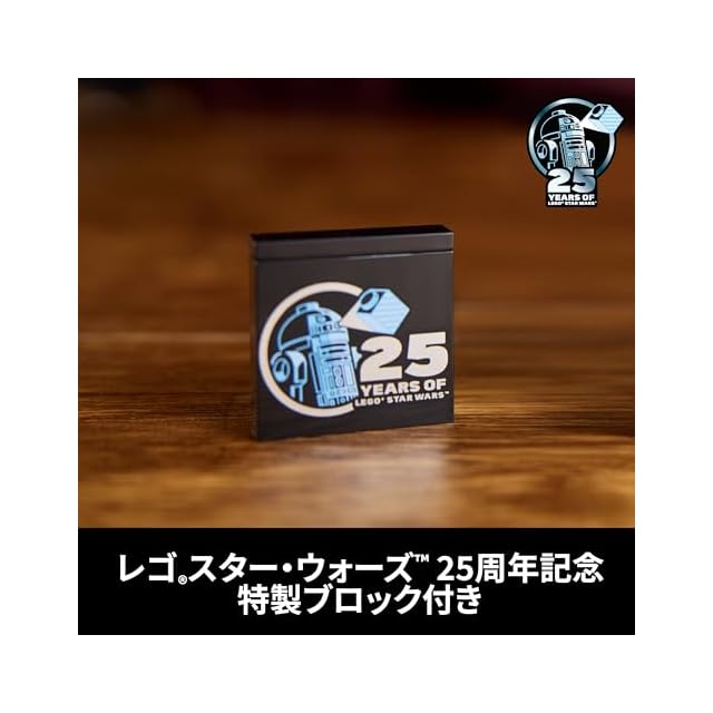 25周年記念モデル – 情報プレート付き専用スタンドにミニフィギュアと並べて飾り、レゴスター・ウォーズ 25周年記念ブロックを取り付ければ完成です