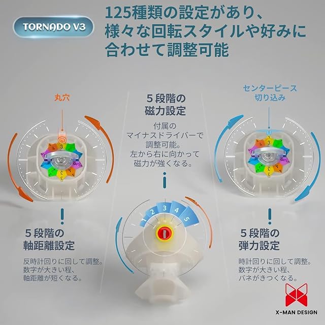 ✅【125種類のカスタマイズが可能に】調整レベルを数字化し、軸距離(センターピース可動距離)5段階、弾力5段階、磁力5段階で調整することができます。様々な回転スタイルや好みの感触に適応することが可能です。Tornado V3でスピードを解放しましょう。