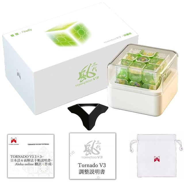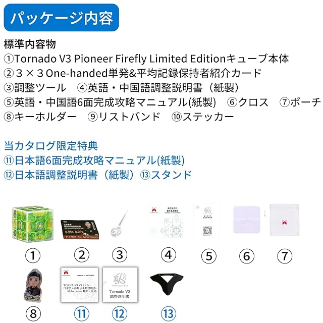 ✅【充実のパッケージ内容】標準内容物【①Tornado V3 Pioneer Firefly Limited Editionキューブ本体 ②3×3one hand単発&平均記録保持者紹介カード ③調整ツール ④英語・中国語調整説明書(紙製)⑤英語・中国語6面完成攻略マニュアル(紙製) ⑥クロス ⑦ポーチ ⑧キーホルダー ⑨リストバンド ⑩ステッカー】に加え、当カタログ限定特典として【⑪日本語6面完成攻略マニュアル(紙製) ⑫日本語調整説明書(紙製)⑬スタンド】が付属します。