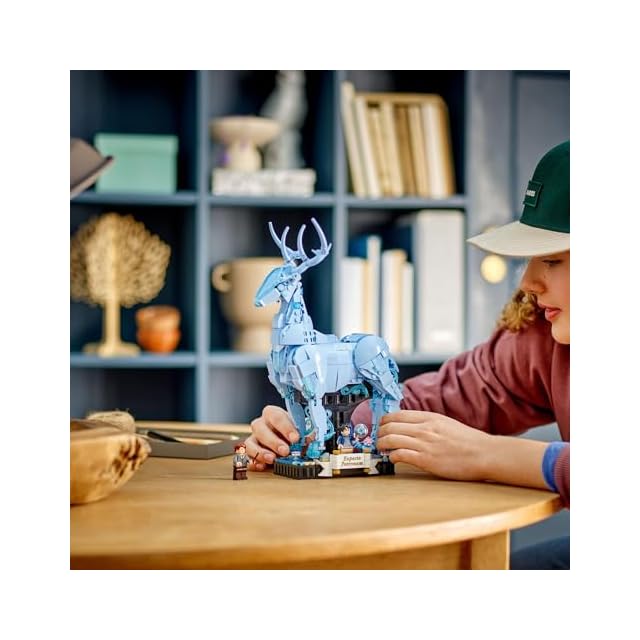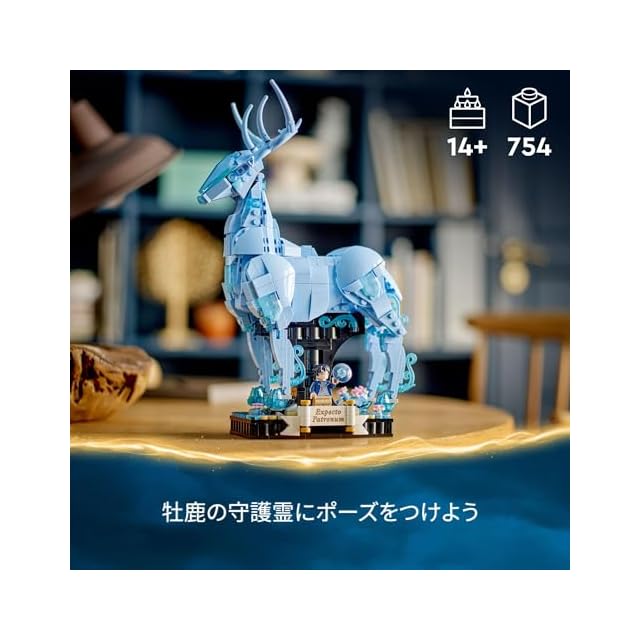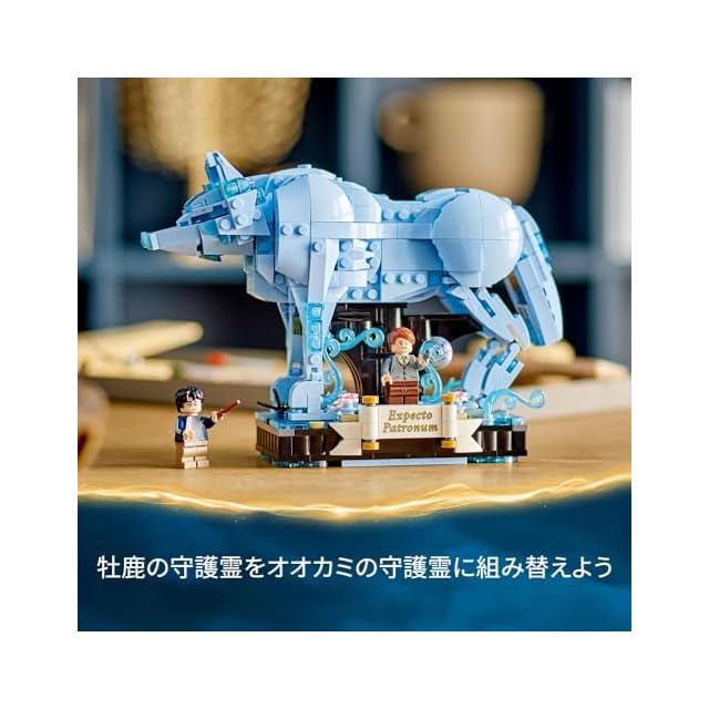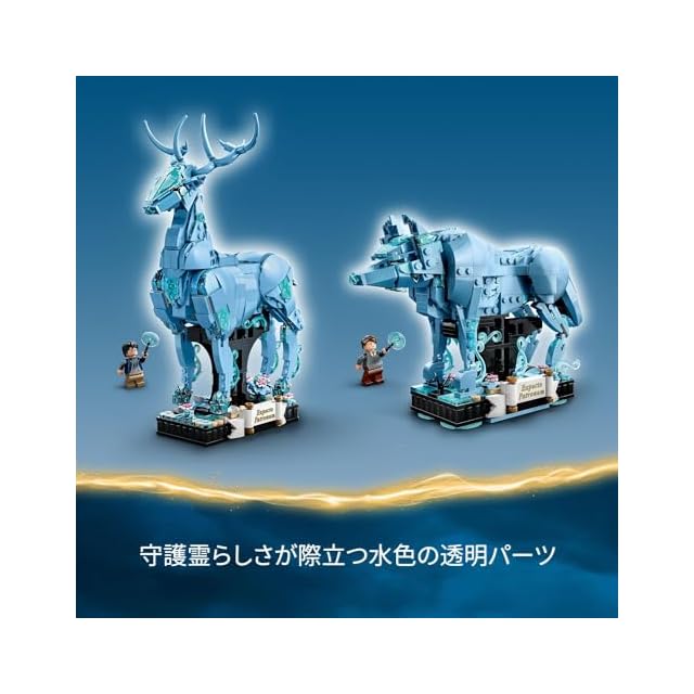 牡鹿の守護霊 – 足を動かせるモデル、水色の透明パーツのほか、ミニフィギュアと装飾パーツのスペースが付いた一体型スタンドが付属