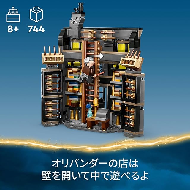 オリバンダーの店 – 両側の壁を広げて遊べます。ハリー・ポッターの杖が入った箱とはしごが付いた棚や、杖の陳列棚2つ、杖26本など、店内も映画とそっくり