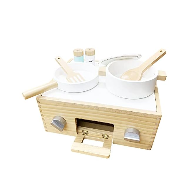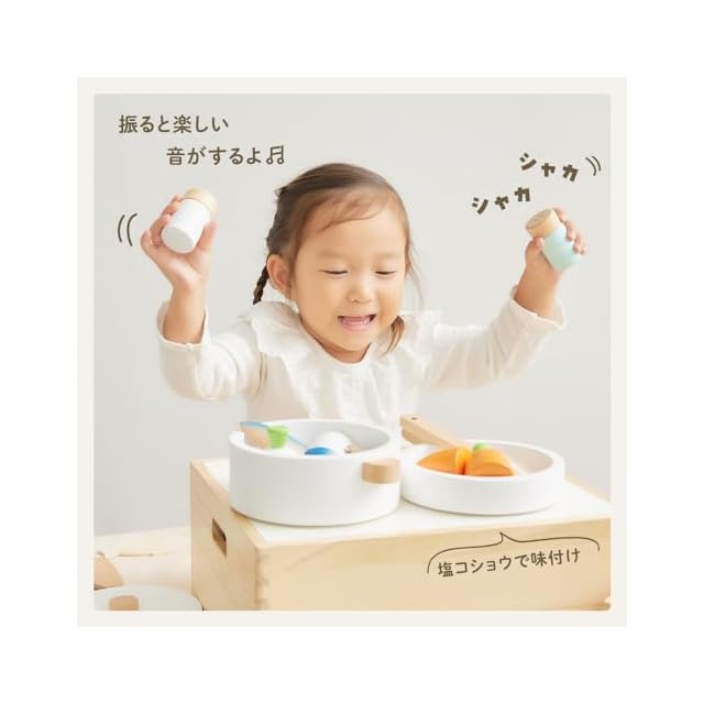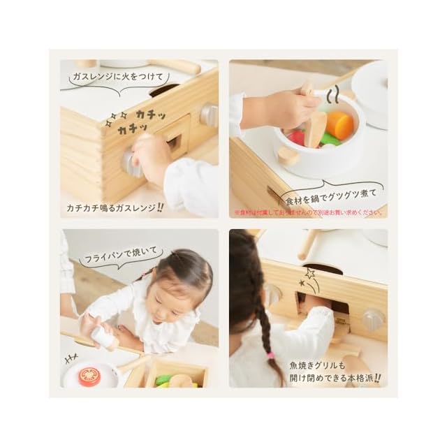 【シンプルデザイン】優しい木の質感と、おままごとの食材が映え、お部屋のインテリアを邪魔しない白を基調としたデザイン。【リアルな体験】カチカチ鳴るコンロと魚焼きグリルでままごと遊びの幅が広がります。野菜をサクッと切って、魚は三枚おろしに!ホタテが開いたら食べ頃!食材が入る大きめ設計の鍋やフライパンの鍋調理器具はもちろん、ままごと食材もたっぷり収納可能。