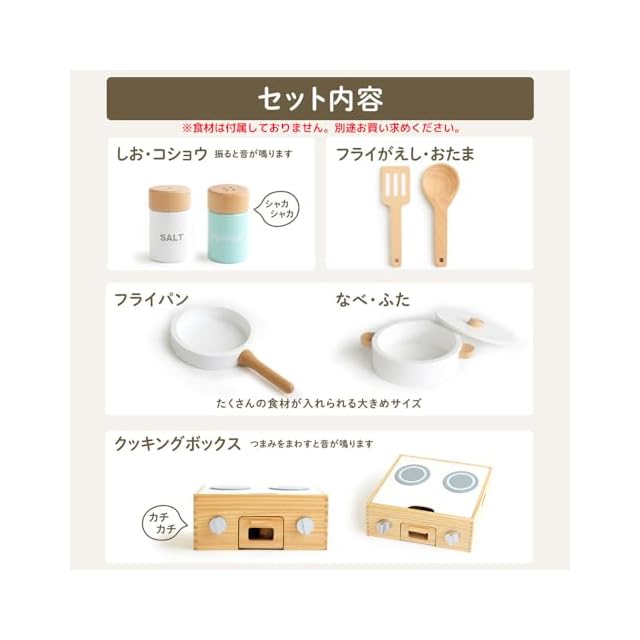 【対象年齢】3歳以上 【セット内容】本体、鍋(ふた付き)、フライパン、塩、コショウ、お玉、フライ返し、食材7種 【素材】天然木、MDF、ABS、磁石