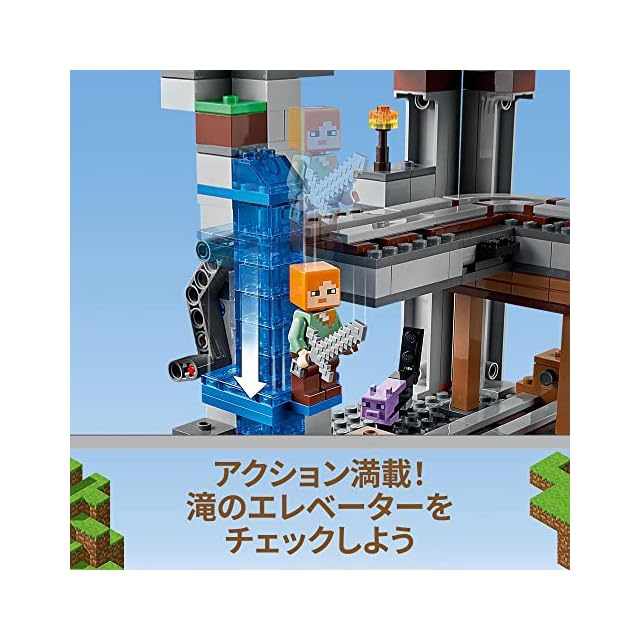 スティーブやアレックス、スケルトン2体、色を変えたネコ、角のあるヒツジ、ムーブルームに加え、滝のエレベーターや崩壊する線路、スライドする地形ブロックなどの機能も付いています。