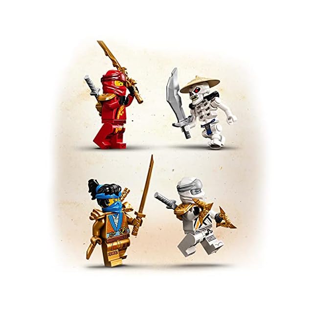 この8歳以上の子供向けの忍者のおもちゃには、ミニフィグ4本(ニャ、カイ、ゼーンに加えて、ホネホネ・アーミー将軍のウィップラッシュ)は、それぞれかっこいい武器を持っています。