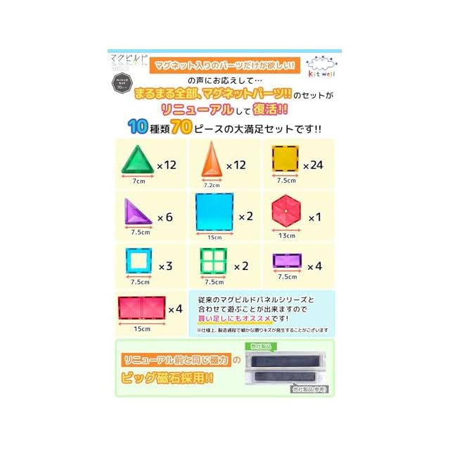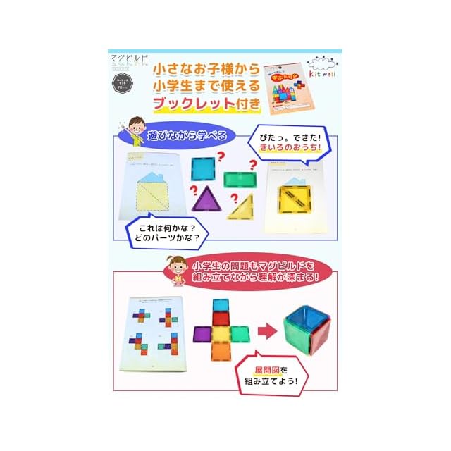 警告: この商品には小さな磁石が含まれています。磁石を飲み込んでしまった場合、腸全体に粘着し、重度の感染症や死亡を引き起こします。磁石を飲み込んだり、吸い込んだりした場合は、すぐに医師の診察を受けてください。 磁石でピタッとくっ付くのでズレるのを気にする必要がなく、小さいお子様でも思い通り・偶然問わず「平面」から「立体」を構成する事が出来る新感覚の磁石ブロックです。 面だけで出来たパーツを組み立てる事で、面で構成される形の概念を「目で見て」「触れて」自然と理解出来るようになるマグネットブロックです。 プレゼントした大人も一緒に楽しく遊べるほどの対象年齢の幅広さも魅力の一つです。遊んであげているという意識も少なくなり、お子様との楽しい時間をお過ごしいただけます。 小さい頃はくっついた・離れたの繰り返しで図形の多様性を、小学生になったら算数の台形の面積計算などで必要な形の分解を、中学生からは立体の図形の体積・表面積の複雑な構造理解に役立ちます。 ひとりひとりの子どもたちに、たのしい時間を。未来のおもちゃ 知育を考える。Kit Well(キット ウェル)は知育玩具の企画・開発を通じて、日本の子どもたちの成長をサポートします。