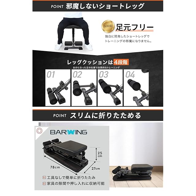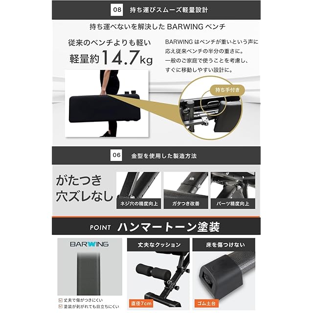 【角度調節10×5+ワンタッチ角度調節】当製品は全4カ所が細かく調整できるようになっています。バックシートが10段階、座面シートが5段階、加えてフットレストは角度が2段階、高さも5段階変更できるハイブリッドベンチ。祖の組み合わせはなんと400通り。角度変更はワンタッチでかんたんに調節ができます。上半身だけでなく、細かく調整できるため絶妙なセッティングができ、好みの角度に出会えます。