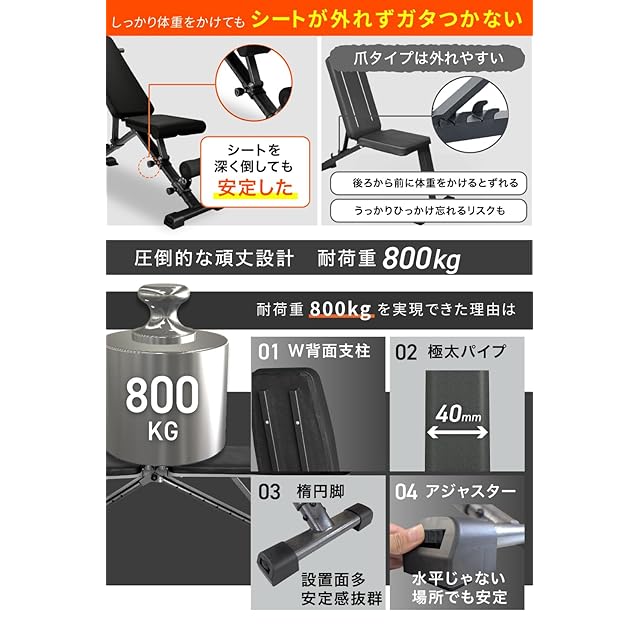 【強靭なフレームで安定構造】当ベンチはフレームの造りや素材までこだわり、安心して使える強さを目指しました。力が均等に加わり、歪みにくく折れにくい2種のフレーム「角形フレーム」「オーバルフレーム」を使用しています。耐荷重はなんと500kg。上部な土台でがっちり支え、抜群の安定感です。