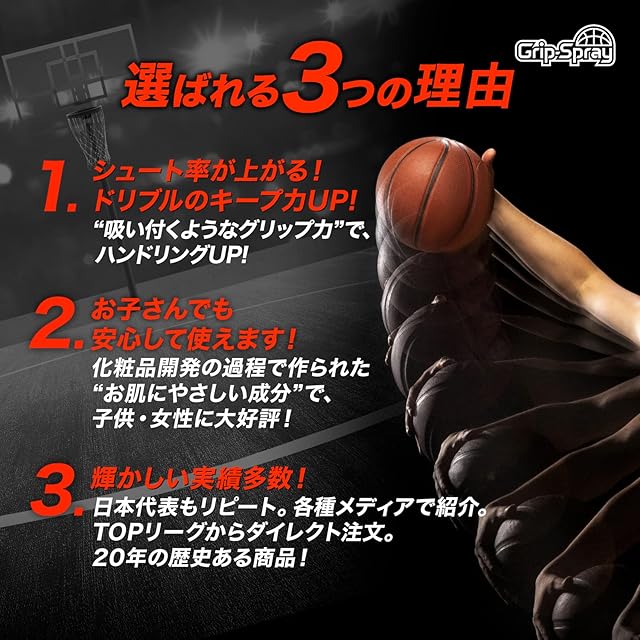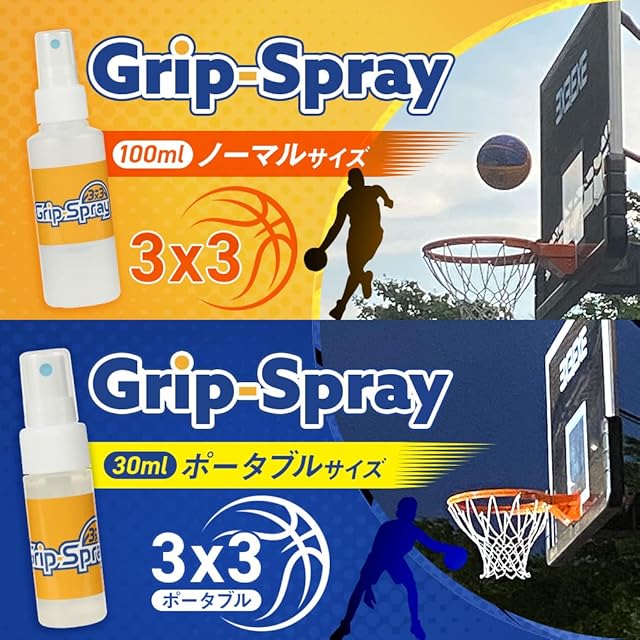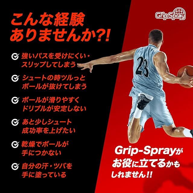 粘性により滑りを止める発想ではなく、素肌に浸透して素肌そのものを滑りにくくするという発想でGrip-Sprayは作られています。潤い成分によりカサついた肌を軟化させることにより激しくも繊細なプレーを要求されるバスケットボールプレイヤーにとって理想的なグリップ力を実現します。さらに保湿成分によりグリップ力の高まった肌の状態を15-20分間保持します。一般的な滑り止めに使われる油分を含まないため使用時のべたつきや粘り気がなく、使用後も水洗いでサッと綺麗に落ちるのでボールや服を汚しません。ポータブルは持ち運びに便利な30mlボトルです。