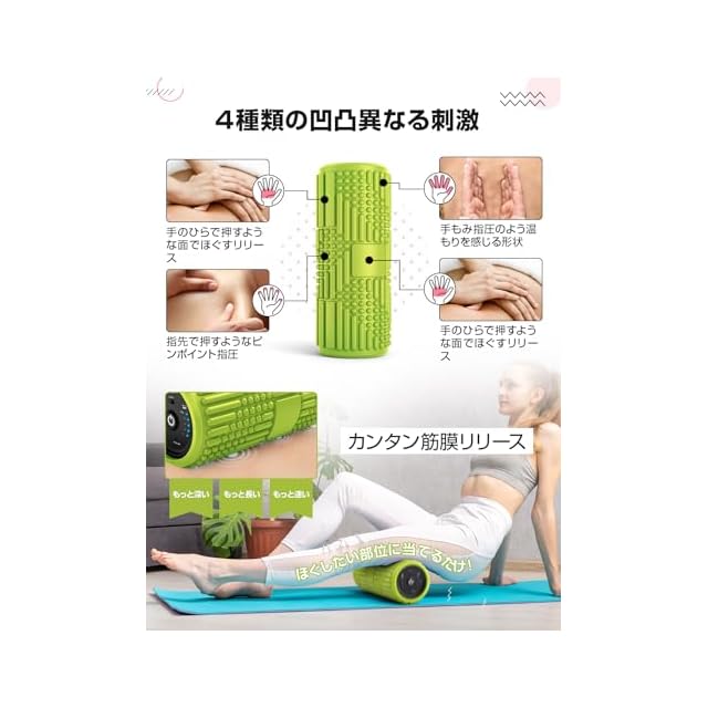 【4種類の凹凸&幅広い対応】筋膜ローラーは表面に4種類凹凸を配置しました。指先、指のひら、指の腹のようなツボ押しで実際に手を使っているように近づけました。使用指導と合わせて、足、背中、肩、腕など、体のあらゆる部分に適し、多種類の筋膜リリース方法が可能です。4mmの突起が刺激を与え、深い振動が身体の深部まで響きます。