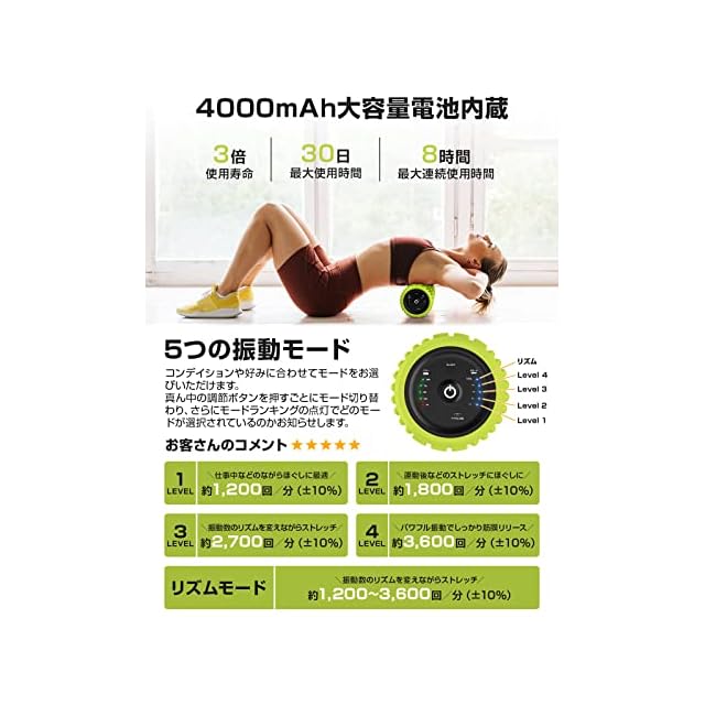 【四段階振動&リズムモード付き】この電動フォームローラーはワンタッチで1000、1800、2700、4000回/毎分の振動強度調整機能を搭載します。筋膜ローラーは優しい振動からパワフル振動まで、お好みや目的に合わせて、 強弱&リズムを調整できます。【スポーツ専門家がお勧め】フォームローラーのレベル1-4の振動強度は専門家によって提案されており、合理的かつ科学的に設定しています。