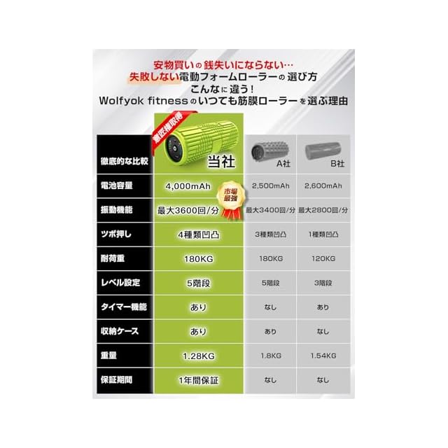 【国内ブランド】Wolfyok fitness フォームローラー 電動 筋膜リリース ローラー 4000mAh 大容量電池 多種類の凹凸 【意匠権取得】 パワフル振動 筋膜ローラー 振動 猫背 ヨガポール グリッド 多種類の凹凸 ピラティス リラクゼーション 足 腰 肩 首 ストレッチ トレーニング 器具 ウルフヨック フィットネス 収納袋付 プレゼント | つむぎ屋