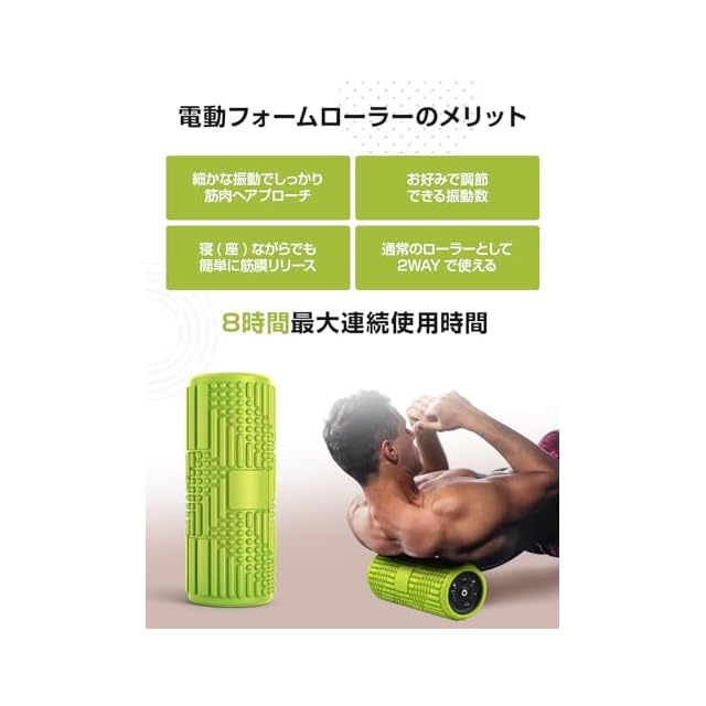 【高品質のEVA素材&適度柔軟さ】この電動フォームローラーは高品質のEVA素材を使用し、丈夫さ、耐久性と柔軟性を兼ね備えて、人体と環境にもやさしいです。さらに、最大耐荷重は180kgですから、毎日利用しても、形が変化せず、長くお使いいただけます。※EVA 素材特有のにおいがする場合がございます。開封後、風通しの良い場所で2、3日置いておくことで軽減されます。