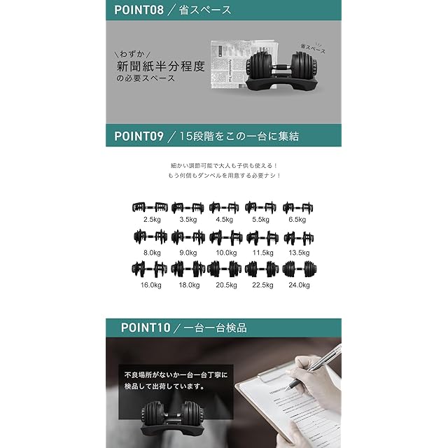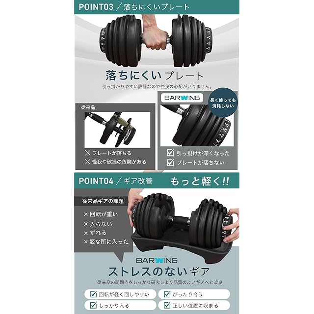 【初心者から上級者まで対応・15段階の重量調節】BARWING可変式ダンベルは、2.5kg〜24kgまで15段階で調節可能。この1台で幅広いトレーニングに対応できます。