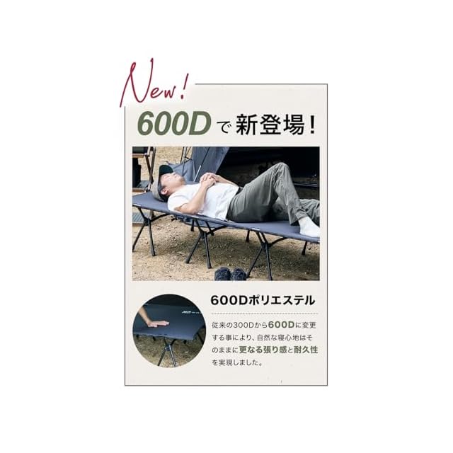 【その他のスペック】 地面の凸凹に左右されない:フィールドの状態に左右されず、どんな場所でも、リラックスしたひと時を堪能してください。 ハイ・ローどちらでも使用可能:コットをハイスタイル・ロースタイルの2つの高さに調節することが可能です。お好みの高さ、テントの大きさに合わせたスタイルでお楽しみいただけます。 大きめの収納袋:ゆとりのある設計のためストレスなく収納することが可能です。車での積載、持ち運びがしやすいサイズ感なのも特徴です。 スペック詳細】・600Dナイロン仕様・耐荷重[150kg]・幅広ゆったりサイズ・ハイ/ロー2way仕様・持ち運び簡単収納バッグ付き