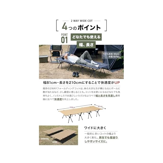 【幅も、長さも大きくなった新しいWAQ 2WAY WIDE COT】- 210 x 80cmのワイドVer.・寝心地はそのままに張り感と強度が増した600Dナイロン採用・冷気や熱をシャットアウト・選べる3カラー【基本性能はそのままに、使いやすさが向上。】これまでどおりの使いやすさを維持しながら、より汎用性のあるモデルに。・従来よりもワイドに。:どんな人にもマッチする幅80cm・長さ210cm:大人2人が適度な距離で座れる長さにアップデート・安定性がUP:レッグフレームを3→4本にすることで安定性がUP・使い勝手は今まで通り:幅や大きさが変わっても今まで通りの使いやすさを維持しています。