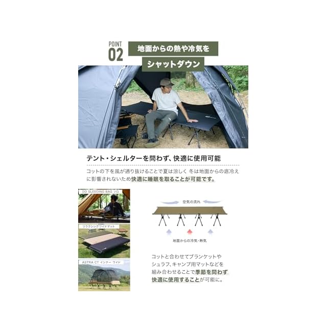 【地面からの熱や冷気をシャットダウン】- コットの下を風が通り抜けることで夏は涼しく、冬は地面からの底冷えに影響されないため快適に睡眠を取ることが可能です。コットと合わせてブランケットやシュラフ、キャンプ用マットなどを組み合わせることで、季節を問わず快適に使用することが可能に。テント内ではもちろん、シェルター内でも快適にご使用いただけます。【高耐荷重を支えるこだわりのフレーム】超々ジュラルミン(A7075)をフレームに採用するだけでなく各フレームのパイプの直径・厚みにもこだわることで150kgの重さを支える事ができる優れた強度を実現いたしました。