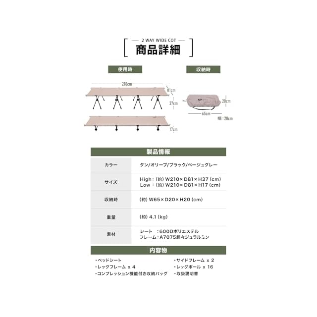 【その他のスペック】 地面の凸凹に左右されない:フィールドの状態に左右されず、どんな場所でも、リラックスしたひと時を堪能してください。 ハイ・ローどちらでも使用可能:コットをハイスタイル・ロースタイルの2つの高さに調節することが可能です。お好みの高さ、テントの大きさに合わせたスタイルでお楽しみいただけます。 大きめの収納袋:ゆとりのある設計のためストレスなく収納することが可能です。車での積載、持ち運びがしやすいサイズ感なのも特徴です。