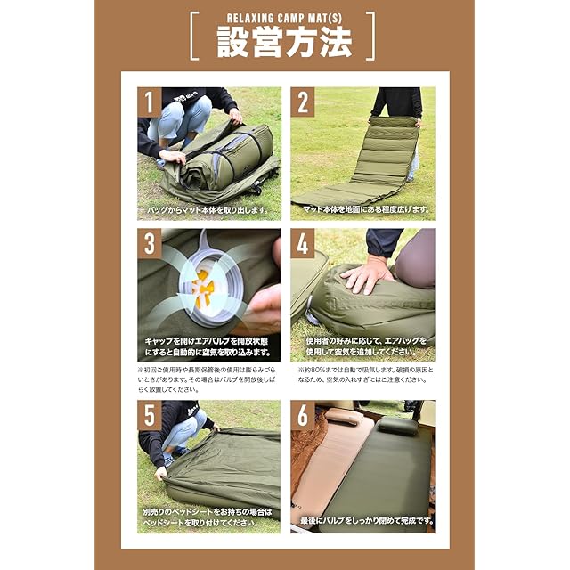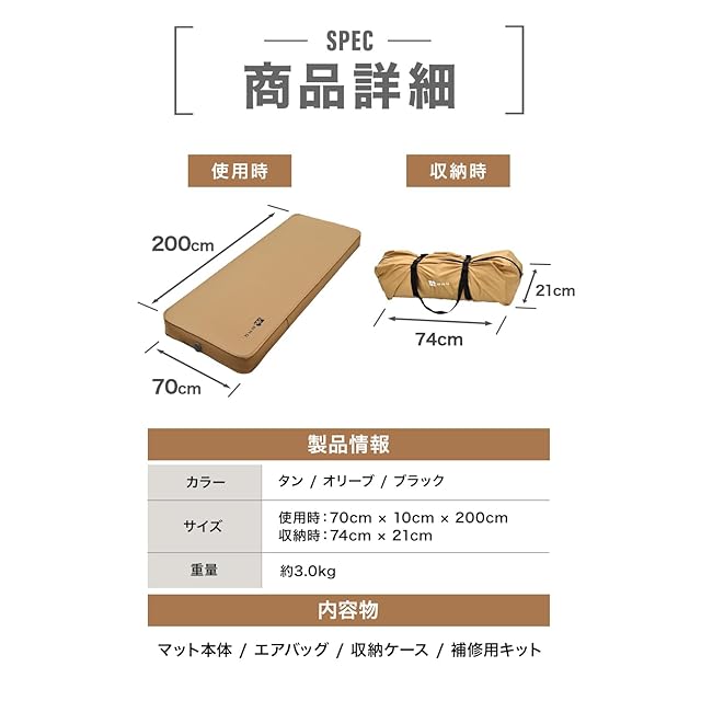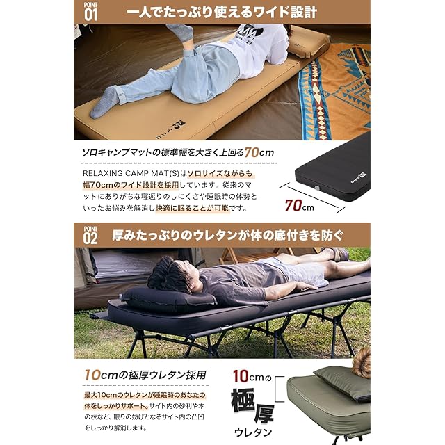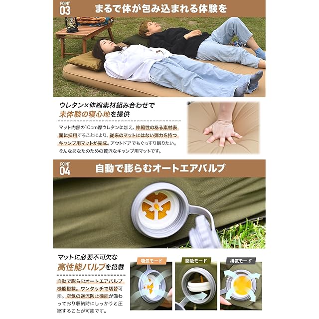 【自動膨張】バルブを開くと自動で空気が入ります!さらに高機能バルブを搭載した事で空気の逆流を防ぎ、より効率よく空気を取り込むことが可能に。 ※初回空気入れ時は出荷状態のため空気の入りが遅く、約10~15分ほどかかります。【睡眠の妨害をシャットアウト】マット厚10cmで車内の段差や地面のデコボコを解消!