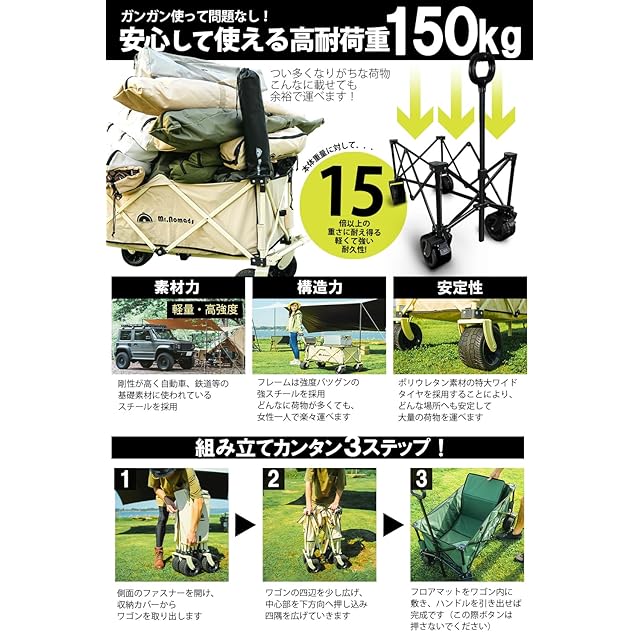 MR. NOMADS 【ラグビー日本代表使用】 キャリーワゴン キャリーカート 4輪 こども乗せれる 折り畳み 軽量 大容量 150L コンパクト 大きいタイヤ 頑丈 耐荷重150kg 自立収納 ワンタッチ収束式 アウトドアワゴン キャンプワゴン カート 子供 (KW001 meisai) リアゲートなし
