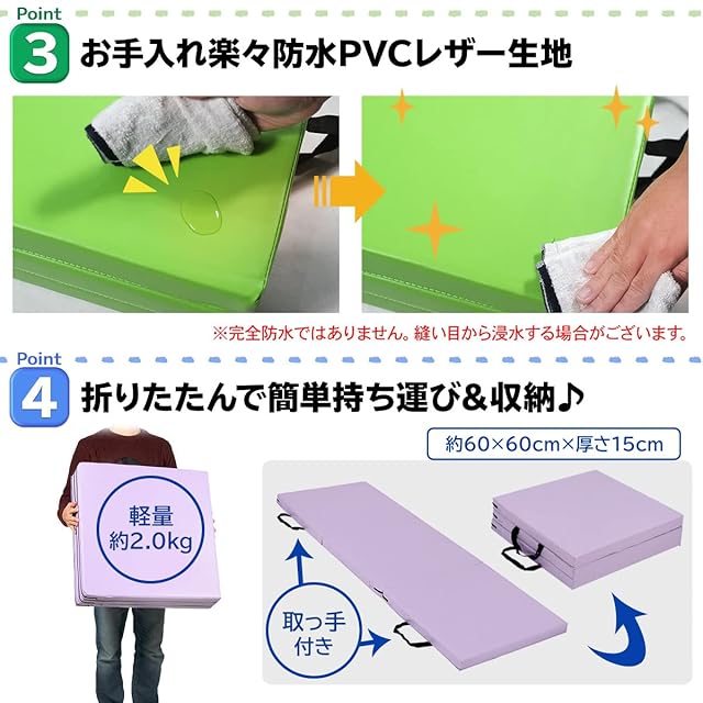 【折りたたみ式のコンパクト収納】こちらのマットは長さ180cm、幅80cmと使用するときは幅広サイズとなっておりますが、折りたたみが可能なので、折りたたみ時のサイズは意外とコンパクト!持ち手も付いていて軽量なので、お子様や女性の方でも楽々と持ち運ぶことが可能です。