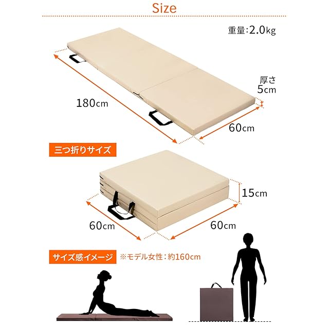 【サイズ/重量】180*60*5cm(折り畳み時:60cm×60cm×15cm)、重量:約2.0kg 【素材/材質】マット;EPE、カバー;PVCレザー 【カラー】ブラック、ブルー、ベージュ、グリーン、パープル、ブラウン、アクアブルー、グレージュ、オレンジ、イエロー、ピンク、レッド 【セット内容】ストレッチマット単品