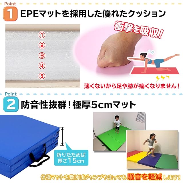【こだわりの素材を採用】KaRaDaStyleの体操マットシリーズは品質にこだわりを持っています。10年以上の製造・販売実績があり、お客様の声より何度も品質改良を行ってまいりました。カバーは匂いを極限まで抑えた防水のPVCレザーを採用し、さらに長くお使いいただけるよう生地の厚さと縫い糸の太さも何度も改良を行いました。中身のマットはEPE発砲素材を数層に重ね、断熱性や防音性を確保。かつ、高い衝撃吸収力を持たせつつ、エクササイズにも耐えうる硬さを採用しております。他社のマットとは一線を画す品質を是非お試しください。