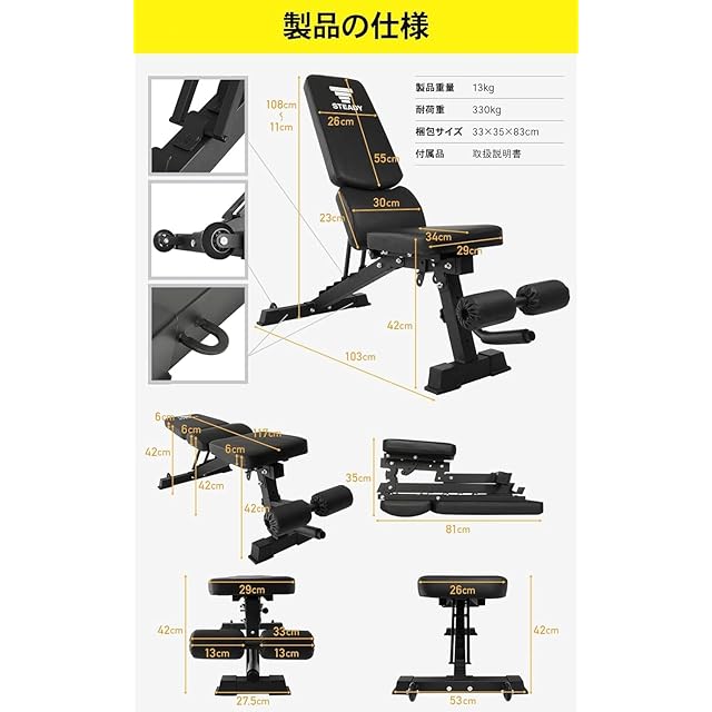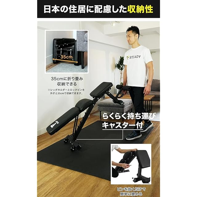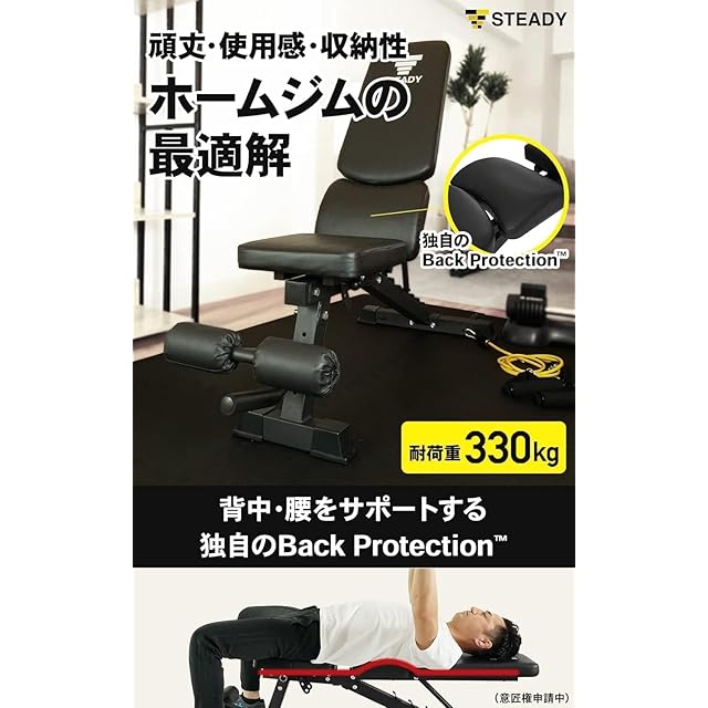 STEADY トレーニングベンチ【耐荷重330kg/背面×座面の角度調整/折畳み可/独自構造の腰保護パッド】ベンチ 腹筋 背筋 インクラインベンチ 筋トレ 足固定 ダンベル ベンチプレス ローマンチェア ST123 アドバンスモデル