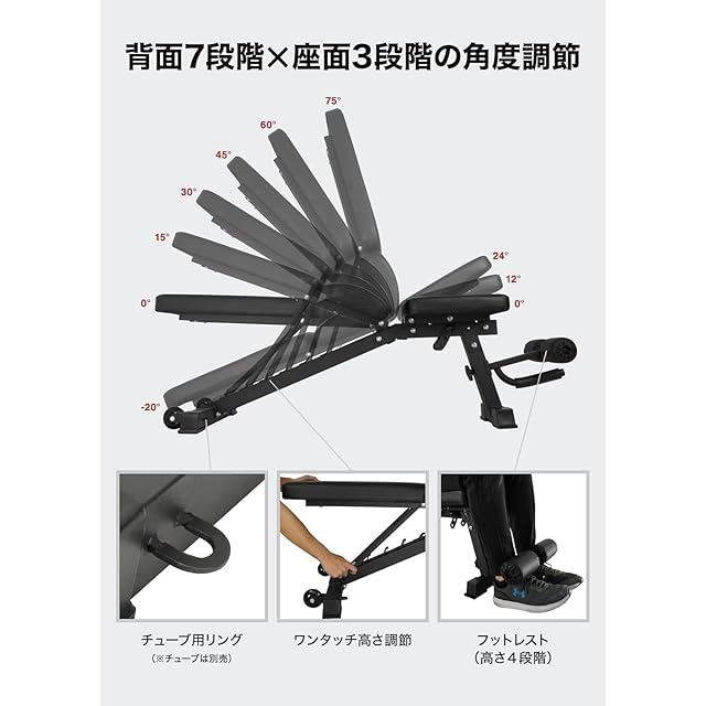 【トレーニングの幅を広げる背面7段階 / 座面3段階の角度調整】インクラインベンチの角度調節は背面7段階・座面3段階・フットレスト4段階と幅広く、わずか約1畳分の折りたたみ可能なコンパクトなデザイン設計ながら、体格や足固定による腹筋・背筋などの行いたいメニューに合わせてマルチなトレーニングが可能です。土台にチューブリングが組み込まれているため、別売りのチューブやダンベルと組み合わせれば20種類以上の幅広いトレーニングが自宅で行える筋トレグッズです。