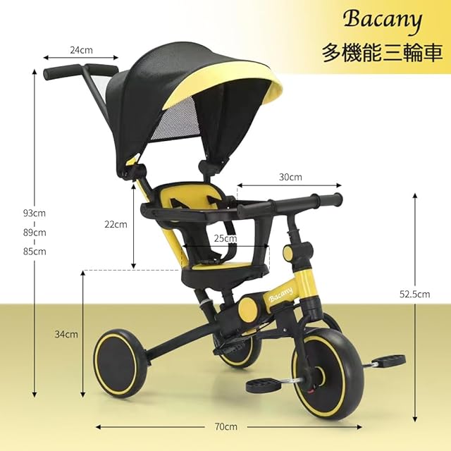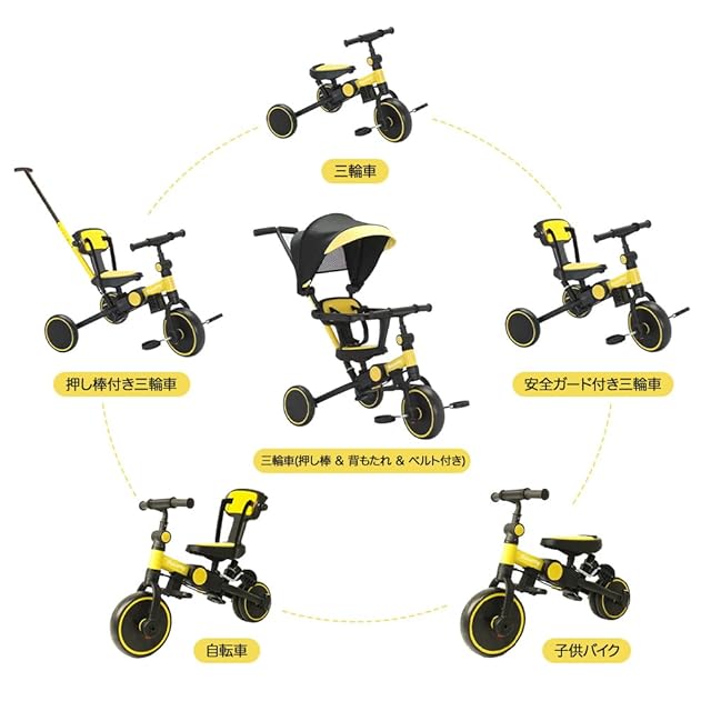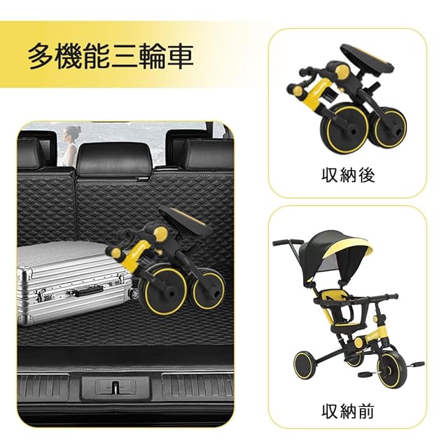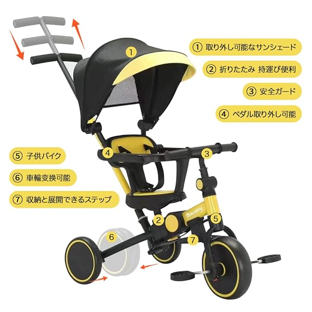 Bacany 子供用三輪車 7in1 三輪車 ステップ付き 折りたたみ 手押し棒 おしゃれ 1歳-6歳 ランニングバイク コンパクト 自転車 おもちゃ 乗用玩具 幼児用 キッズバイク プレゼント おもちゃ 調整可能 お祝い ギフト シートベルト付き (イエロー) | つむぎ屋