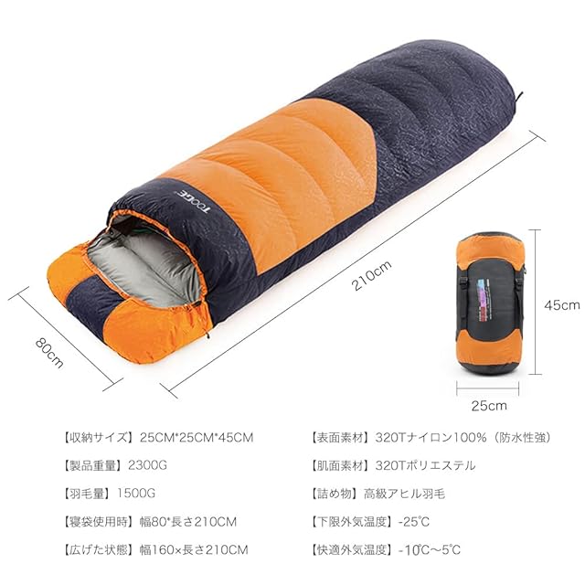 【もっと暖かくて軽い】本製品は2021年中旬によりよいダウンを変更して、2.3kg寝袋は改良版でございます。もっとよいダウンを換えて、従来品より2倍の暖かさ、快適使用温度は-5度から-10度までアップして、重さも400g下がりました。収納袋に入れてから、ベルトで縦方向・横方向バランス良く圧縮され、ボールのようにコンパクトにすることができる寝袋。