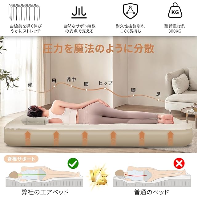 【寝心地よい・快適睡眠】エアーベッドの内部は環状構造で全体が弾力性があり、体圧を分散させ、背骨と腰への圧力を軽減し、背骨の自然な曲線の維持をサポートし、どんなポジションで寝ていても、各凹凸が体を点で支えることでベッドと人体を密着させることができ、体にフィットし、快適な寝心地を与えてくれるマイベッドになります。