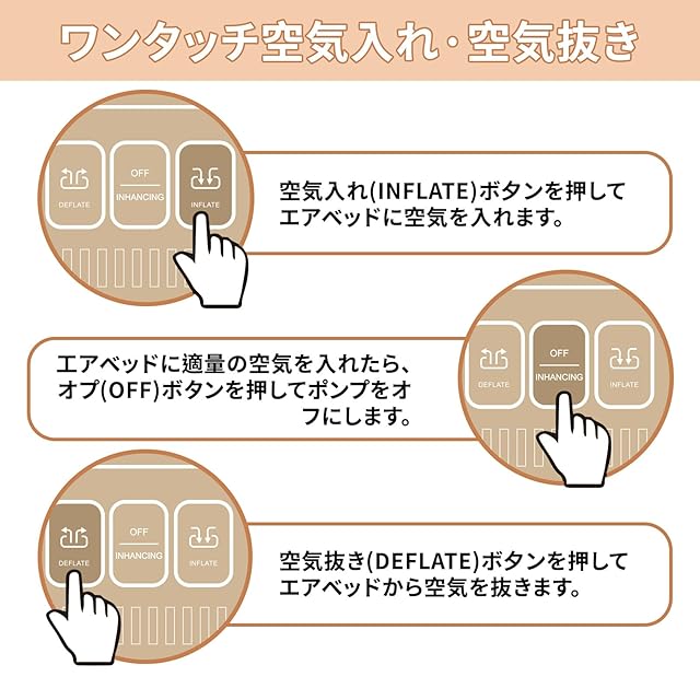 【内蔵電動エアポンプ】 内蔵の電動エアーポンプで、約3~5分で簡単にベッドを膨らませることができます。 操作が簡単で、時間を節約でき、便利です。 内蔵ポンプを空気を入れる位置に回すだけで、自動的にベッドに空気を入れることができます。 また、膨らませる量を調節することで、お好みの硬さに自由に調整できます!*注: マットレスには超気密性がありますが、長い時間の使用の後で自然な空気漏出があります、これは正常な現象です、ちょうど状況に従って膨脹可能なベッドを膨脹させる必要があります。