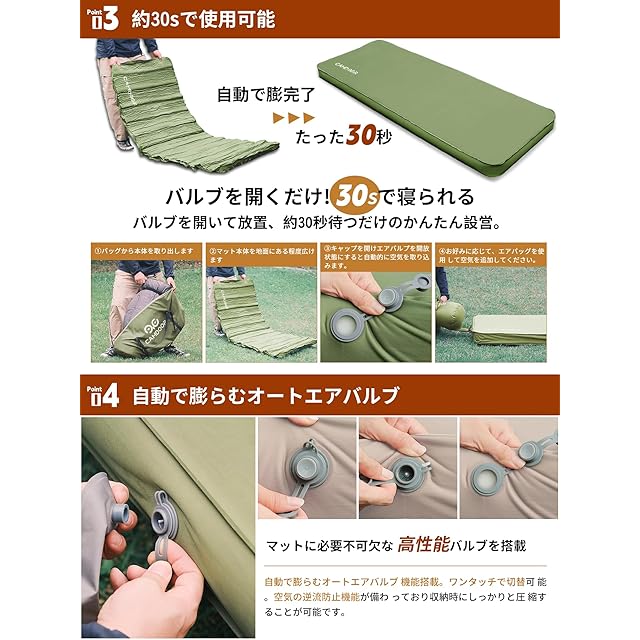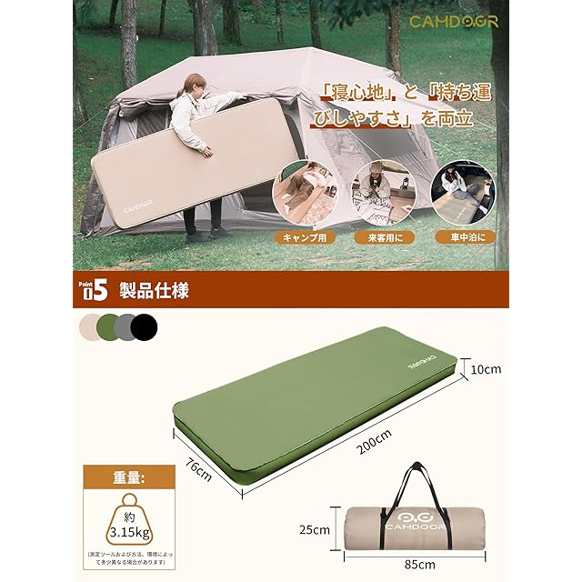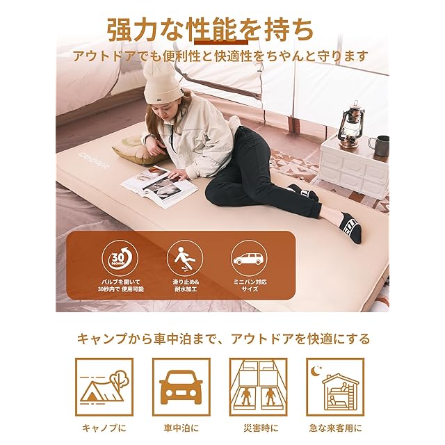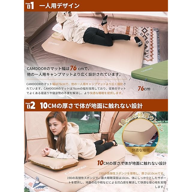 CAMDOOR キャンプ マット エアーマット 厚手 10cm 【30秒自動膨張・ソフトな手触り】インフレーターマット 自動膨張 キャンパー 車中泊 キャンプ用品 防水防潮 防災 安全無臭 四季使用可能 インフレータブルバッグと収納バッグ付属 持ち運び便利 簡単収納 | つむぎ屋