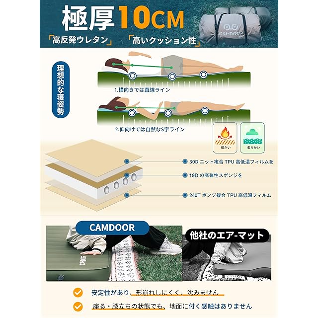 3つのメリット:❶市販の他のインフレーターマットり幅が広く200*135cm特大サイズ!さまざまな寝姿勢を自由にすることができます。❷90秒で自動的に膨らみ、50Dニット複合TPU高低温フィルムを採用し、お肌により快適な寝心地を提供します。 ❸極厚マットで段差感なし!10cmの厚さで、地面の硬さや凸凹感を簡単に解消できます。 また、地面からの冷気を遮断し、深い眠りを促します。