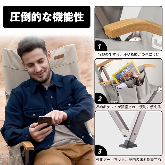 圧倒的な機能性、快適な座り心地を徹底追求!:側面着脱式ポケット付き、実際のキャンプでは「欲しいものがすぐ手に届く場所にある」という快適さに繋がってきます。竹製の曲がる手すりはオシャレだけではなく汗や指紋がつきにくい。強化フートマット、室内の床も保護する。