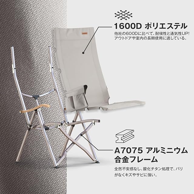 1600Dポリエステル、素材力満点!:ICECOは1600Dポリエステルを採用し、他社の600Dに比べて、アウトドアや室内の長期使用に適している。あつい季節も蒸し暑くなく、抜群の通気性と快適な座り心地を確保できます。座面の裏も防水加工し、雨でもタオルでちょっと拭くだけ座れます、雨に濡れてもカビにくい防カビ加工も施しています。通常のアウトドアチェアの座面幅は50cm前後、ICECOでは最大幅58cmのワイド設計を実現。体が大きい方でもゆったりとご使用いただけます。