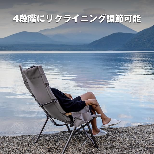 四段階のリクライニング機能:ハイバックの背面が四段階にリクライニング可能のアウトドアチェア。シチュエーションに応じて好みのポジションで寛げます。室内だけでなく、キャンプやバーベキュー、ピクニックで活躍します。