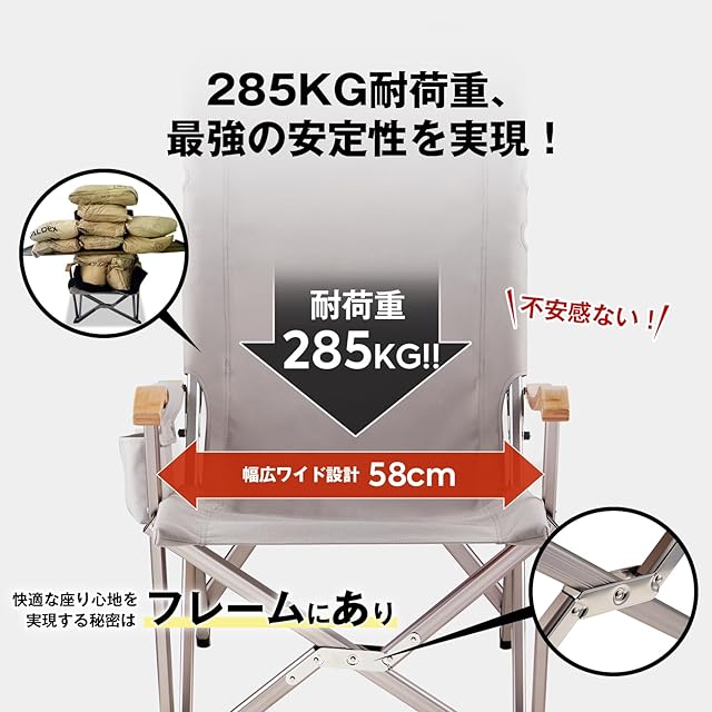 265KG耐荷重、最強の安定性を実現!:アウトドア椅子は1600Dポリエステル、A7075アルミ合金フレームを採用した設計で、265KGまでの耐荷重!さらに、座面を深くするし、ハンモックのように体にフィットし、ゆったりと包み込まれる最強の安定性を実現したアウトドアチェアです。
